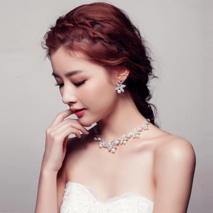 Created pearl flowers dream Korean Necklace + earrings Butterfly jewelry Sets married bride jewelry