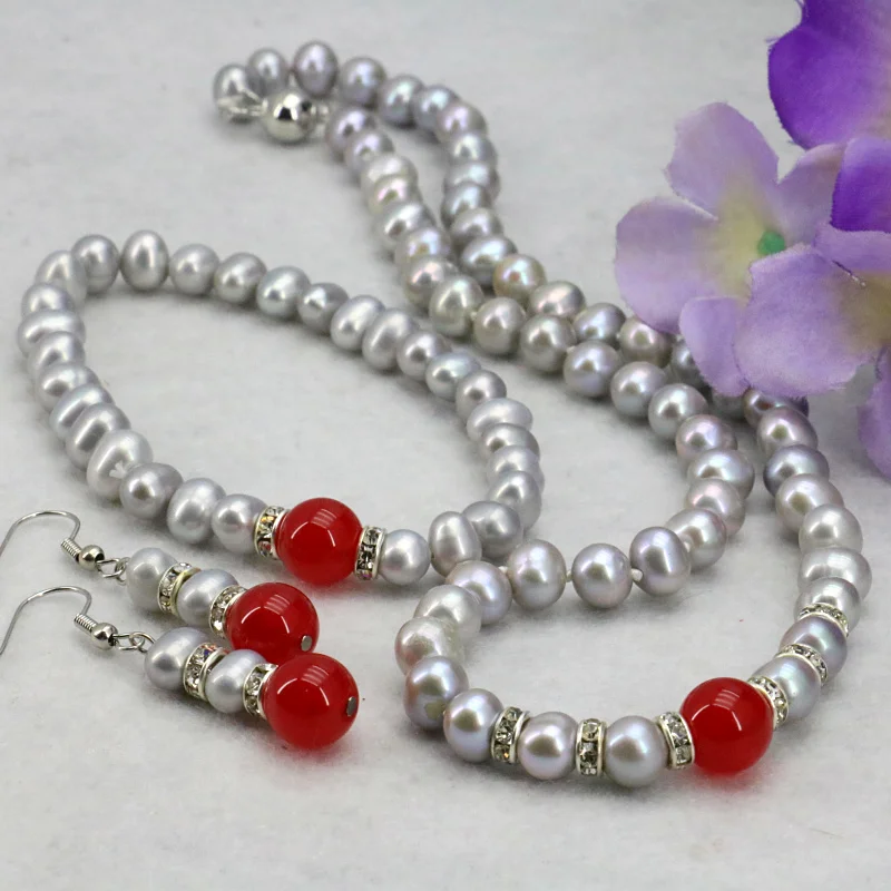 HIGH QUALITY Women Gift word Love women Fashion Jewelry Gray pearl red gem necklace set 7-8mm necklace 18" brace