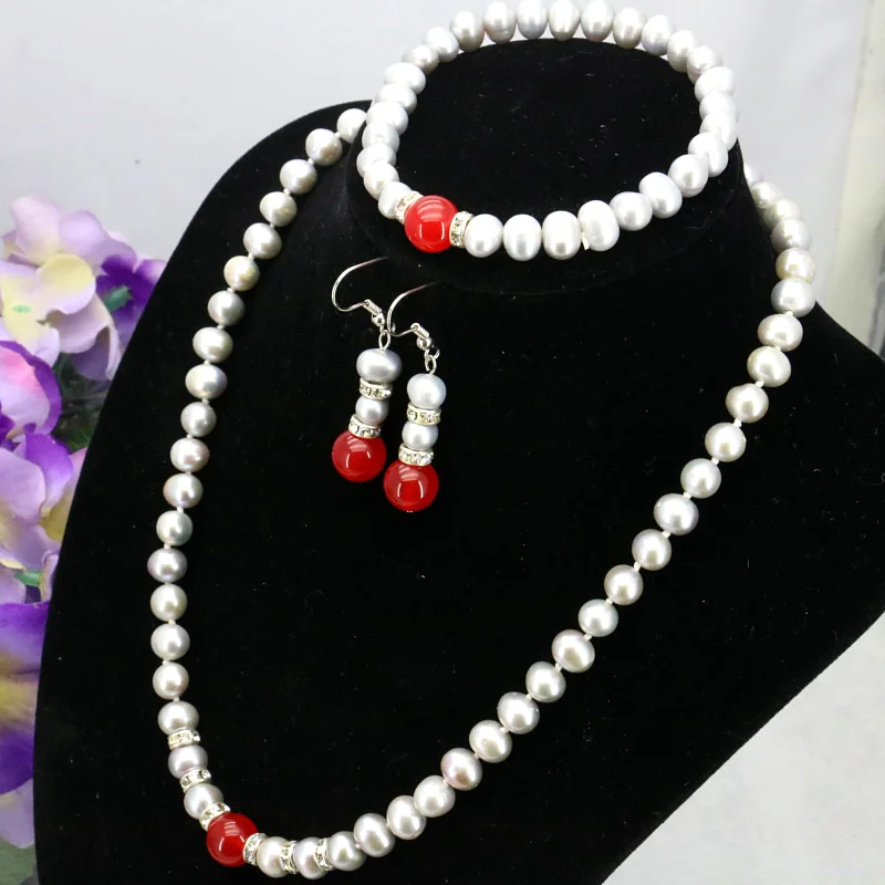 Best Seller Women Gift word Love women Fashion Jewelry Gray pearl red gem necklace set 7-8mm necklace 18" brace