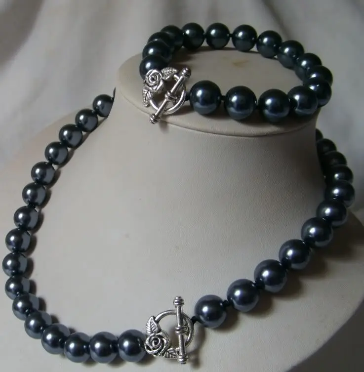 Hot Sale southsea 12mm black shell pearl necklace bracelet silve