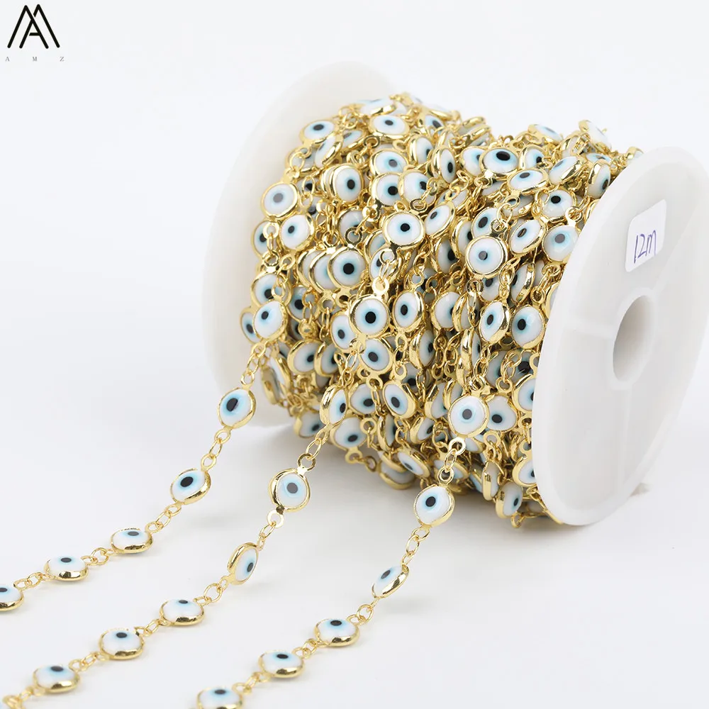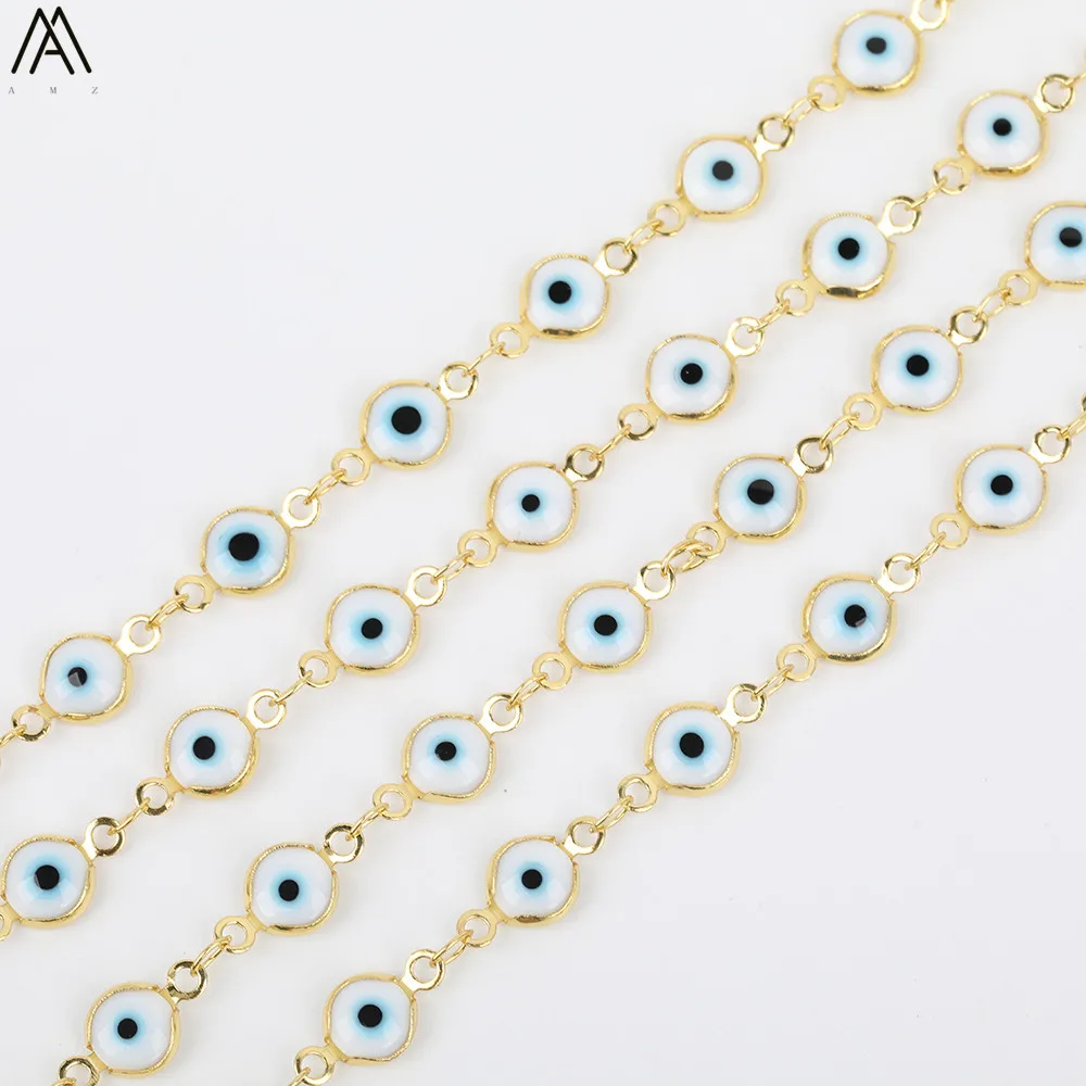 BEST 5meter 7mm White Color Evil Eyes Beads Rosary ChainsFlat Round Enamel Beads Gold Chains Jewelry Cho